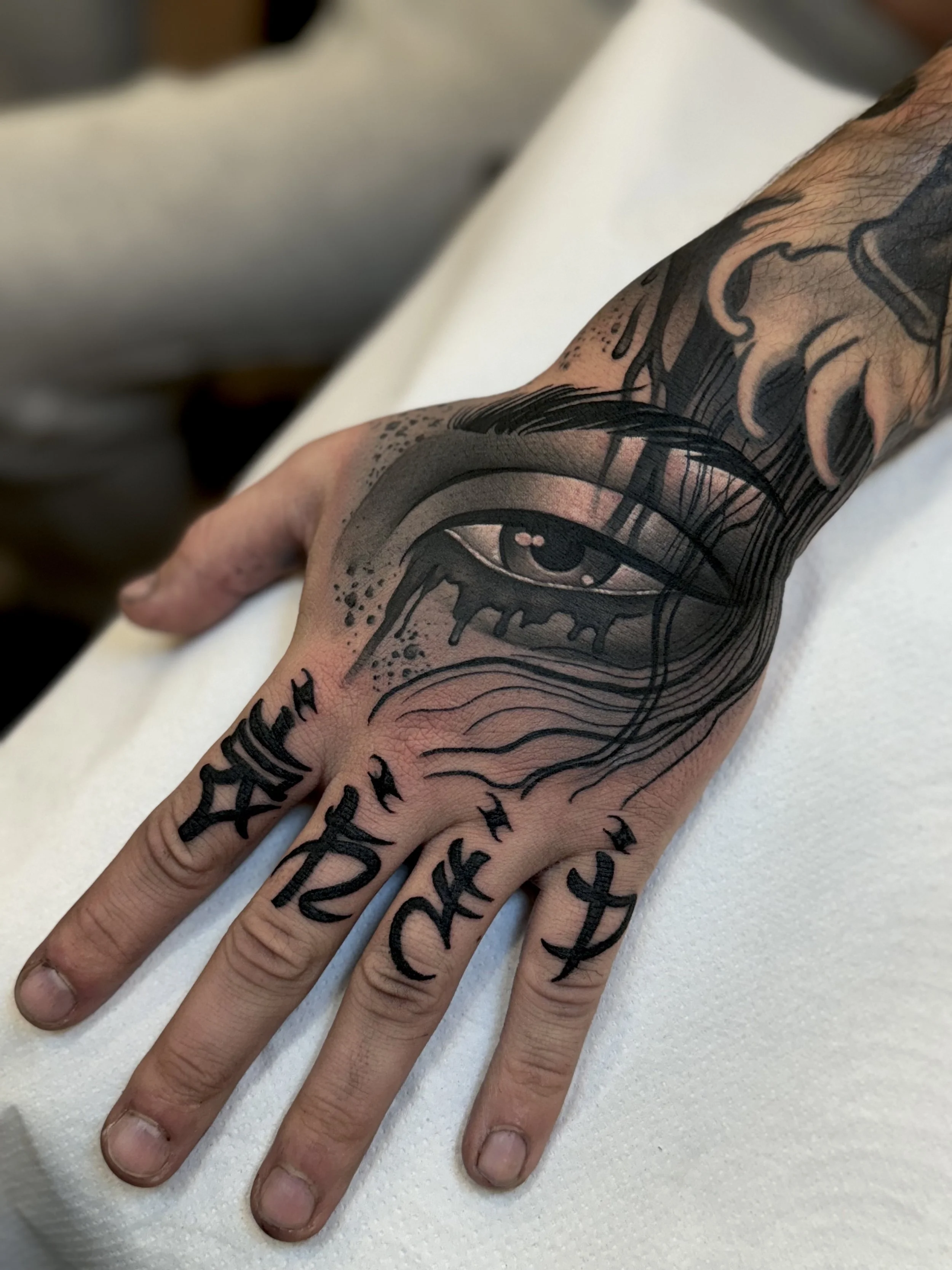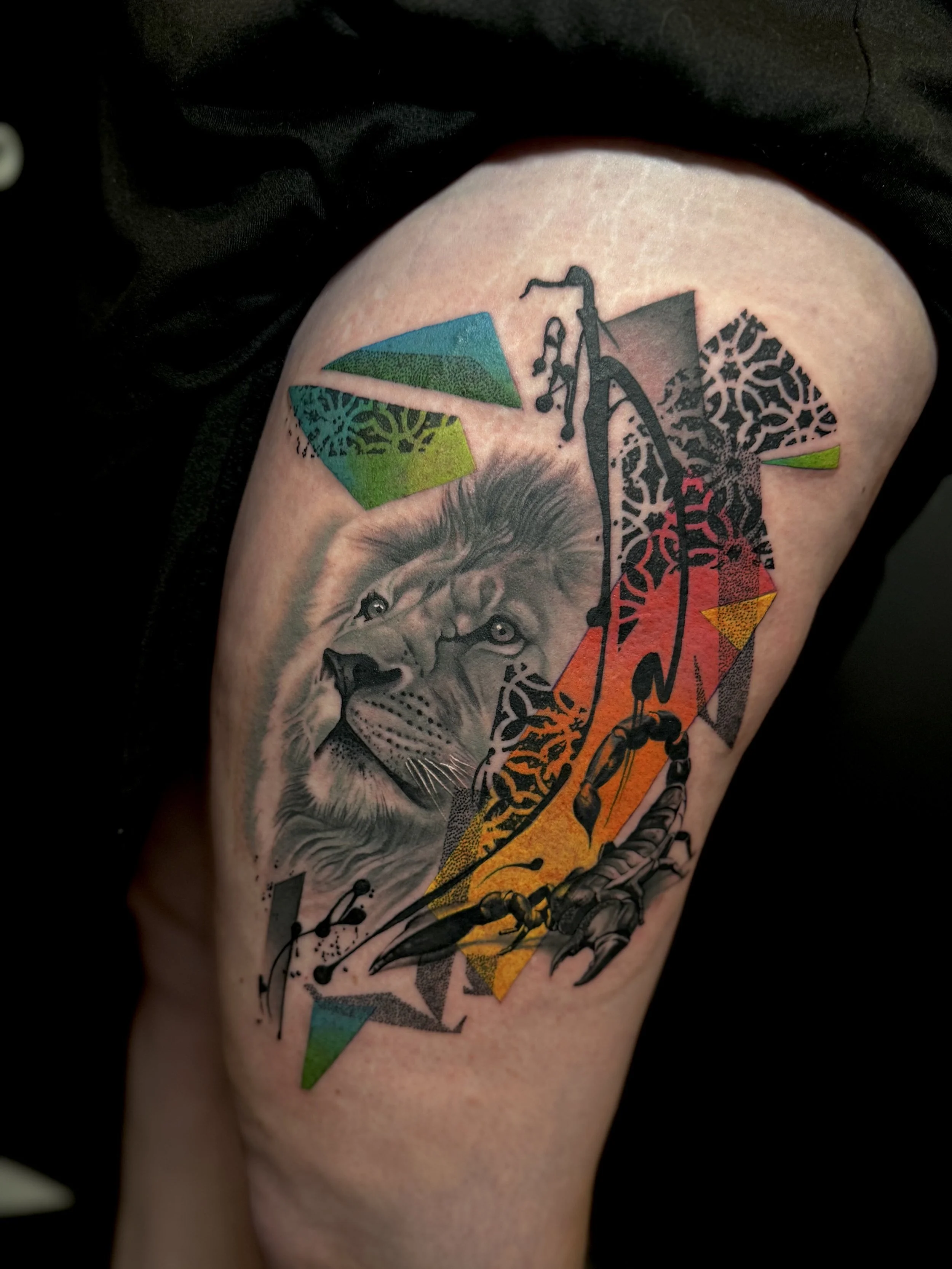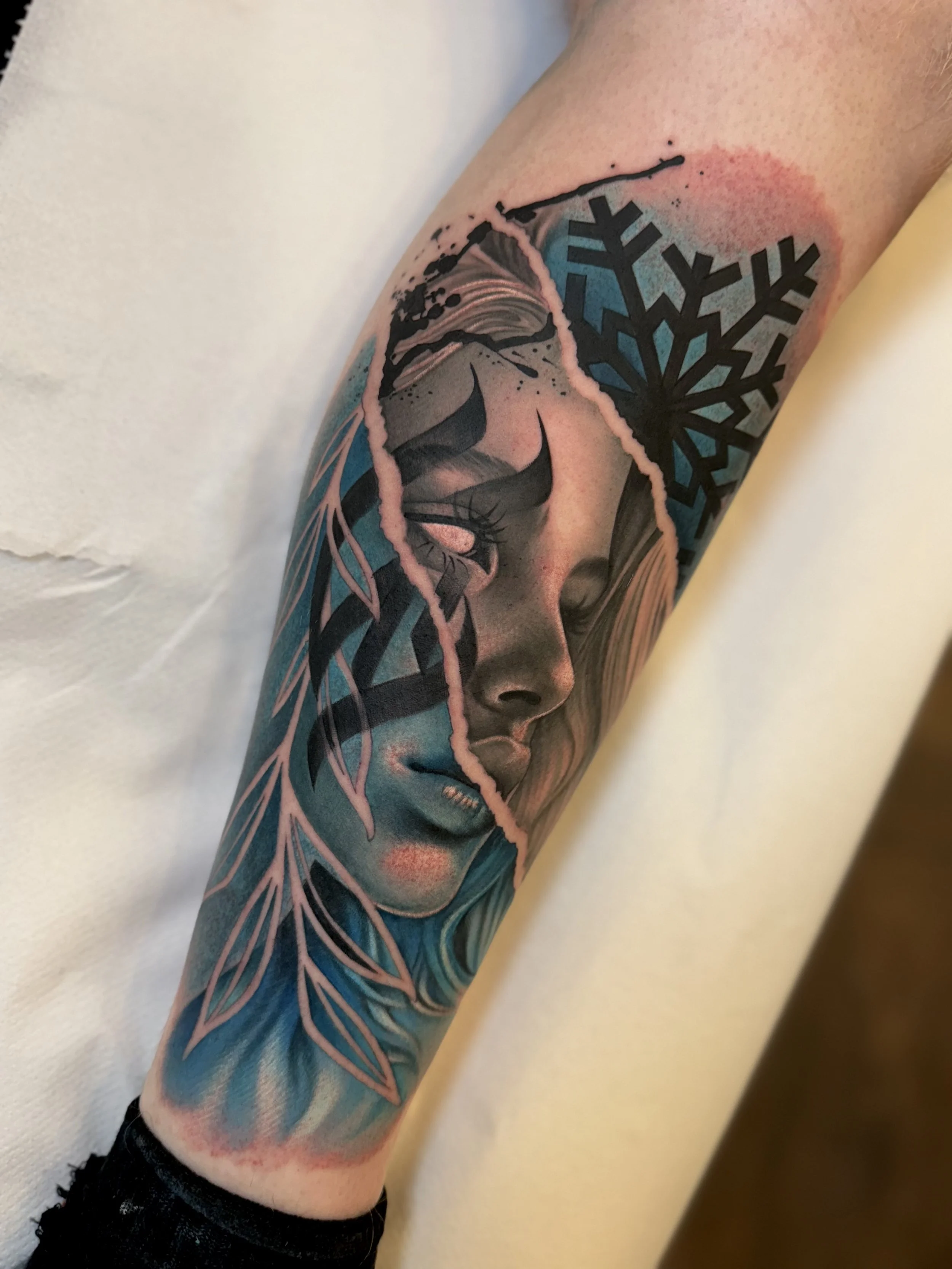 A woman with tattoos on her arm and torso, with black tape covering her nipples and black ink body art designs across her chest and stomach.