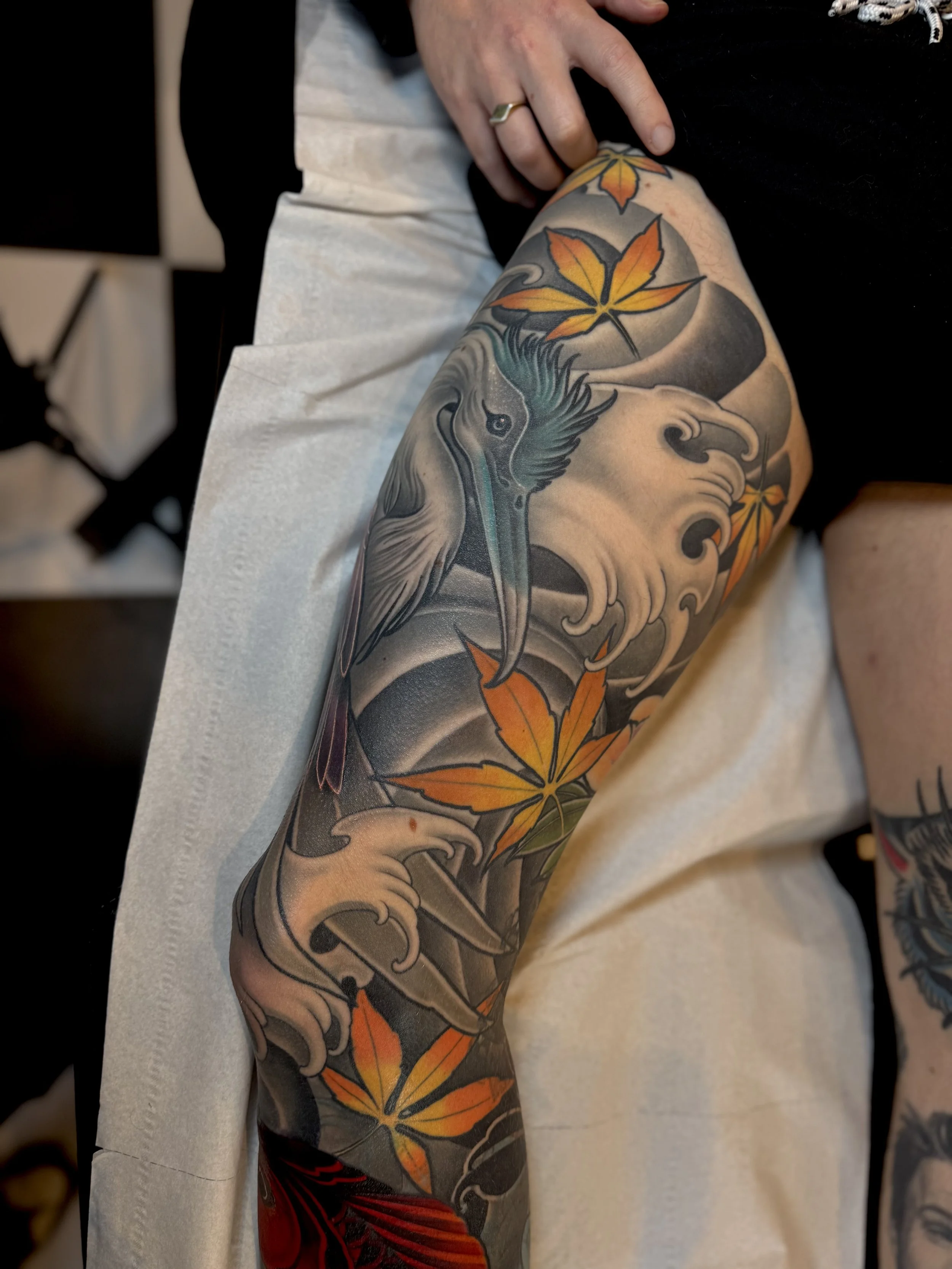 Colorful tattoo of a heron with flowing water, surrounded by orange and yellow autumn leaves.